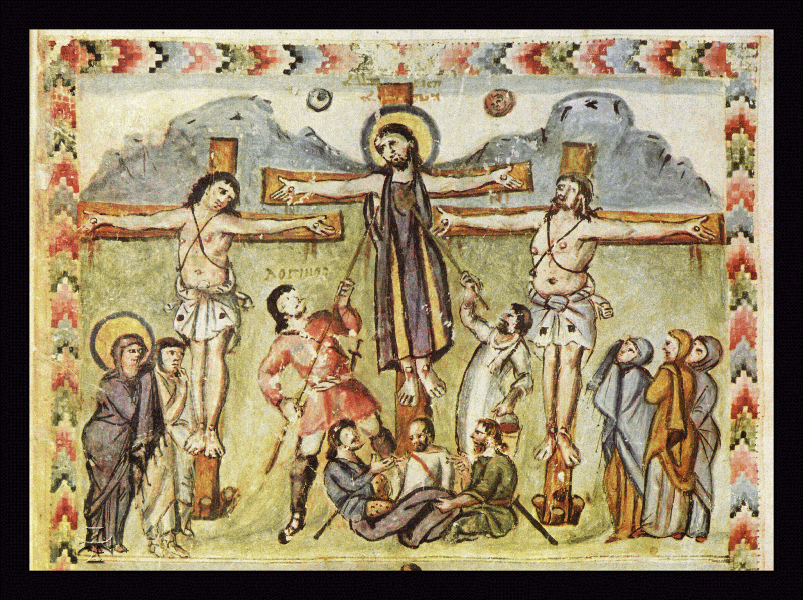 manuscrito iluminado de la Crucifixión detrás de un lancero. Dicho manuscrito, una versión siríaca del Evangelio según Juan ilustrada por un tal Rabulas, data del 586 y se conserva en la
